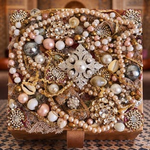 This box is both functional and ornamental—created to hold jewelry, letters, or cherished keepsakes—yet it stands equally as a sculptural art object. Every element is hand-placed, resulting in a luxurious, dimensional surface that catches the light and invites closer inspection.