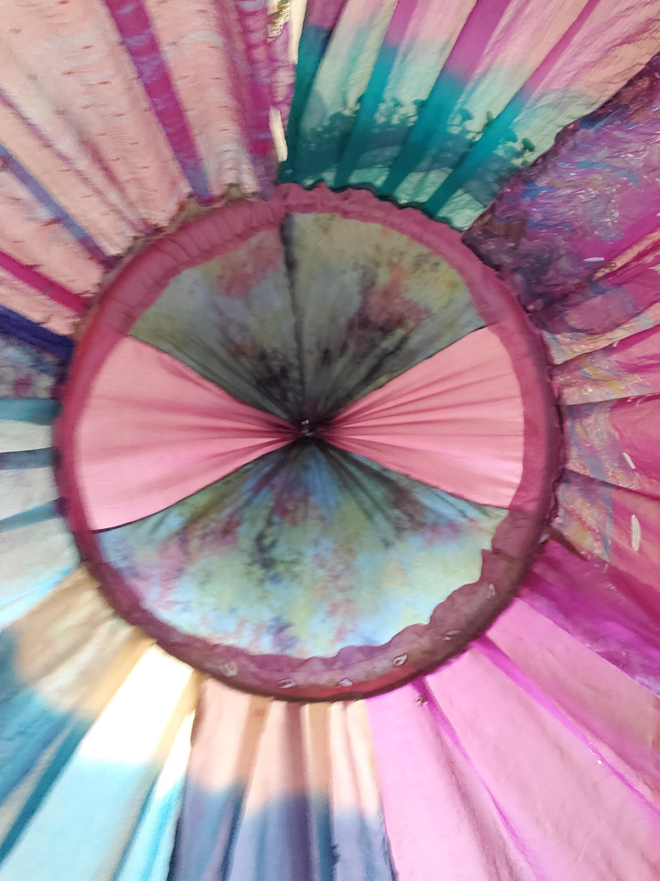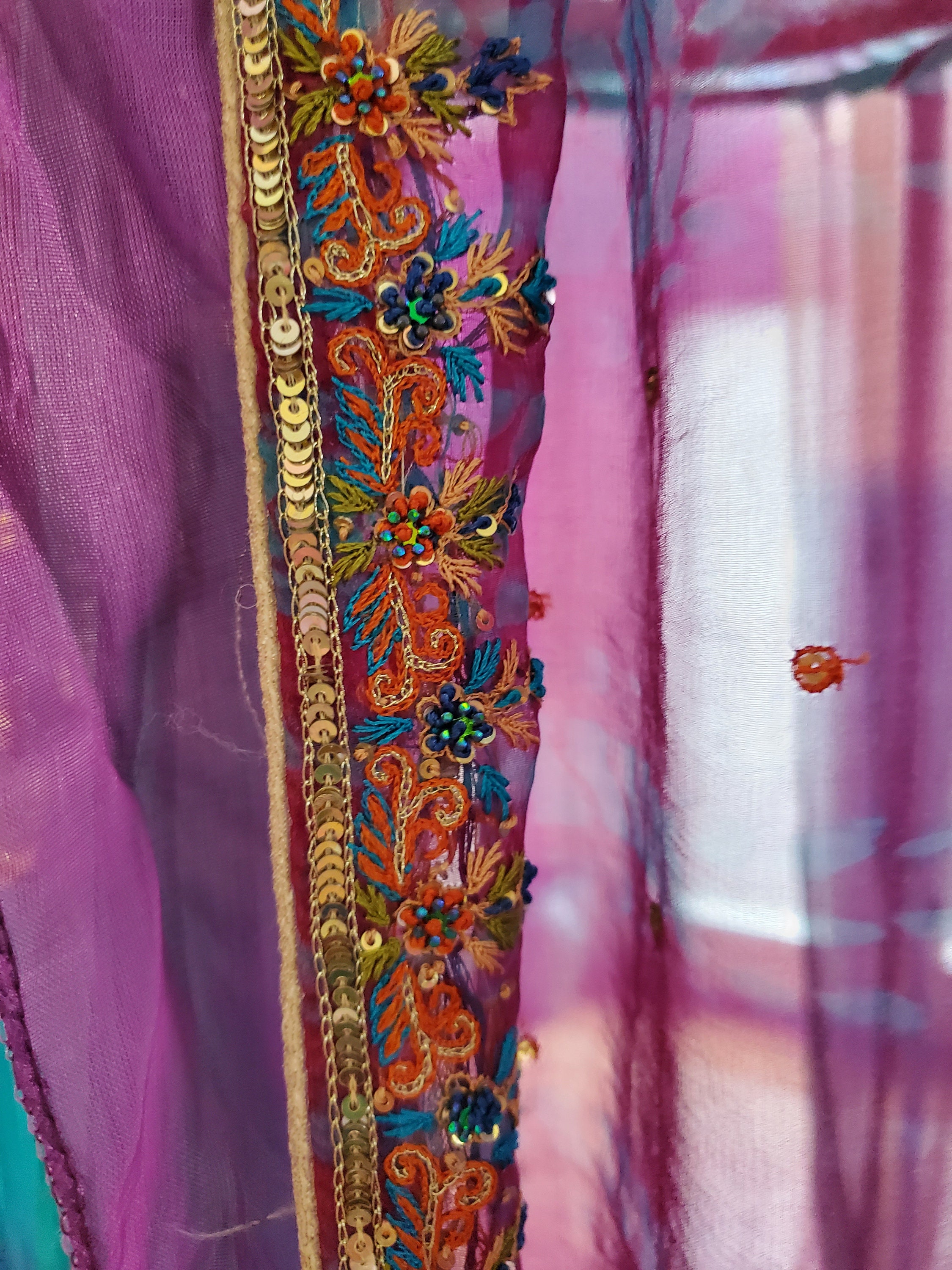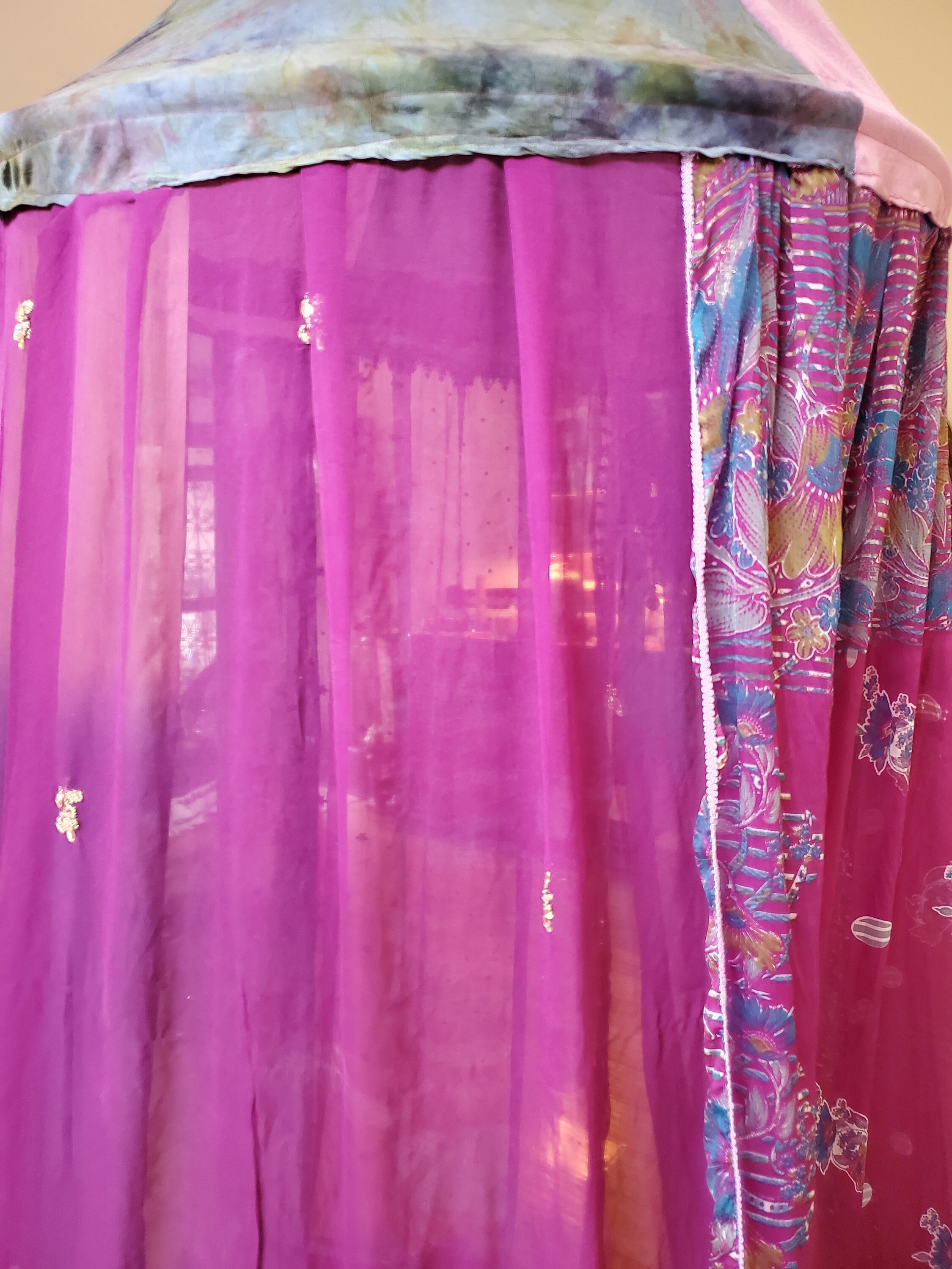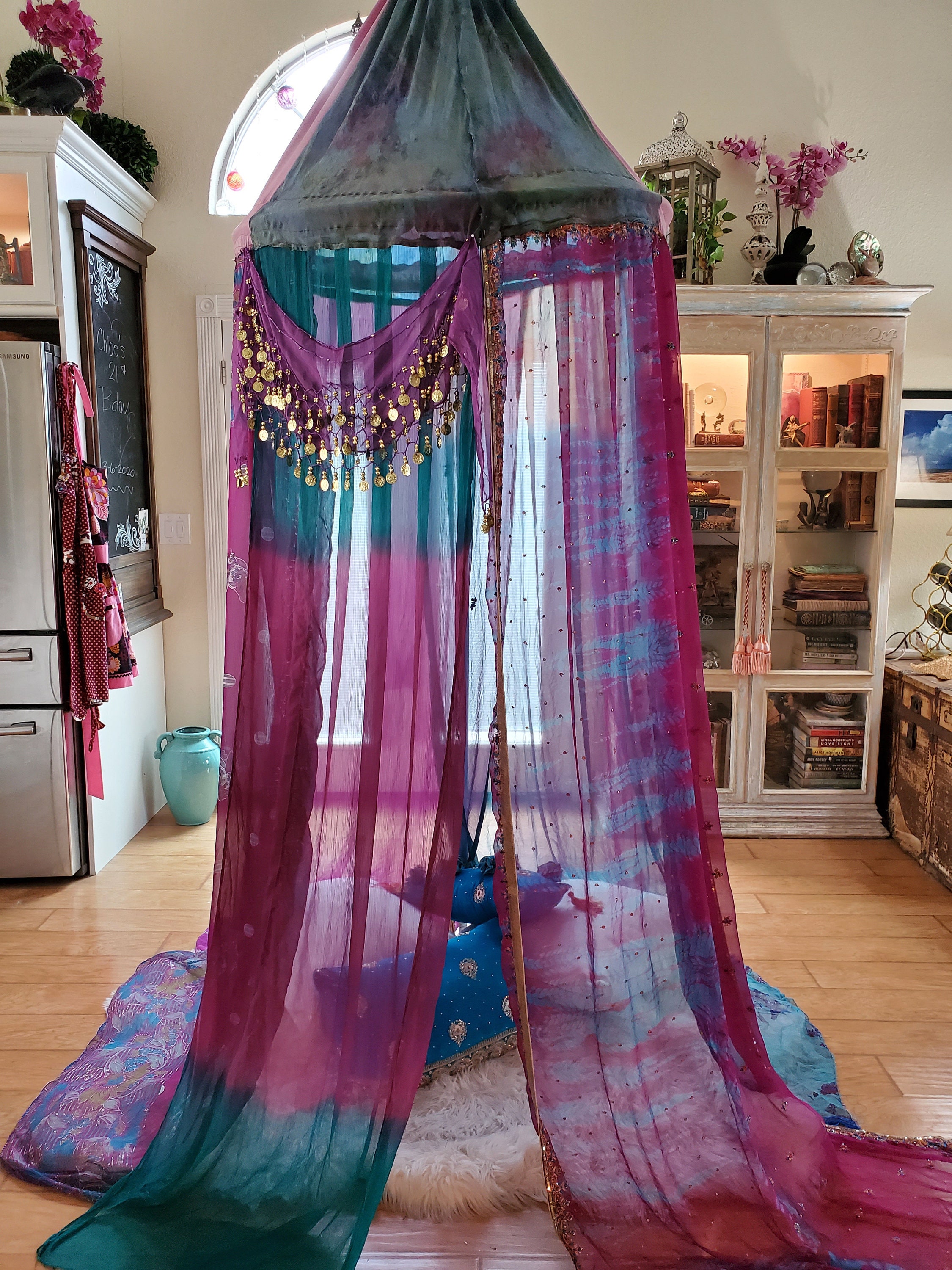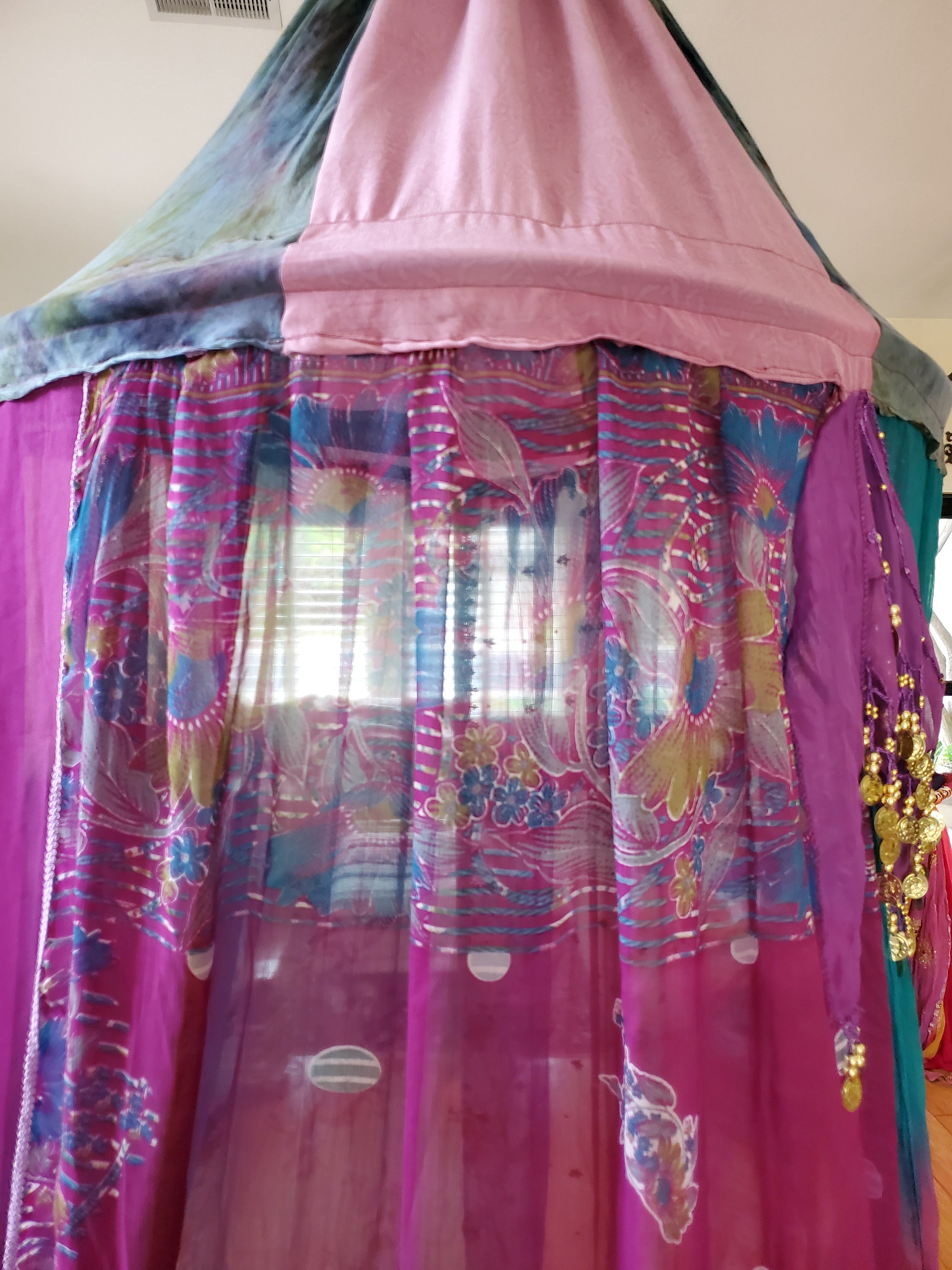 Made from upcycled Material, Cotton fabric, and hoop. 32 inches around and at least 12 - 15 feet in height. The sides can be spread out and pinned up for a larger area. A beautiful purple gypsy belt with coins was added to compliment the magical qualities of this canopy.