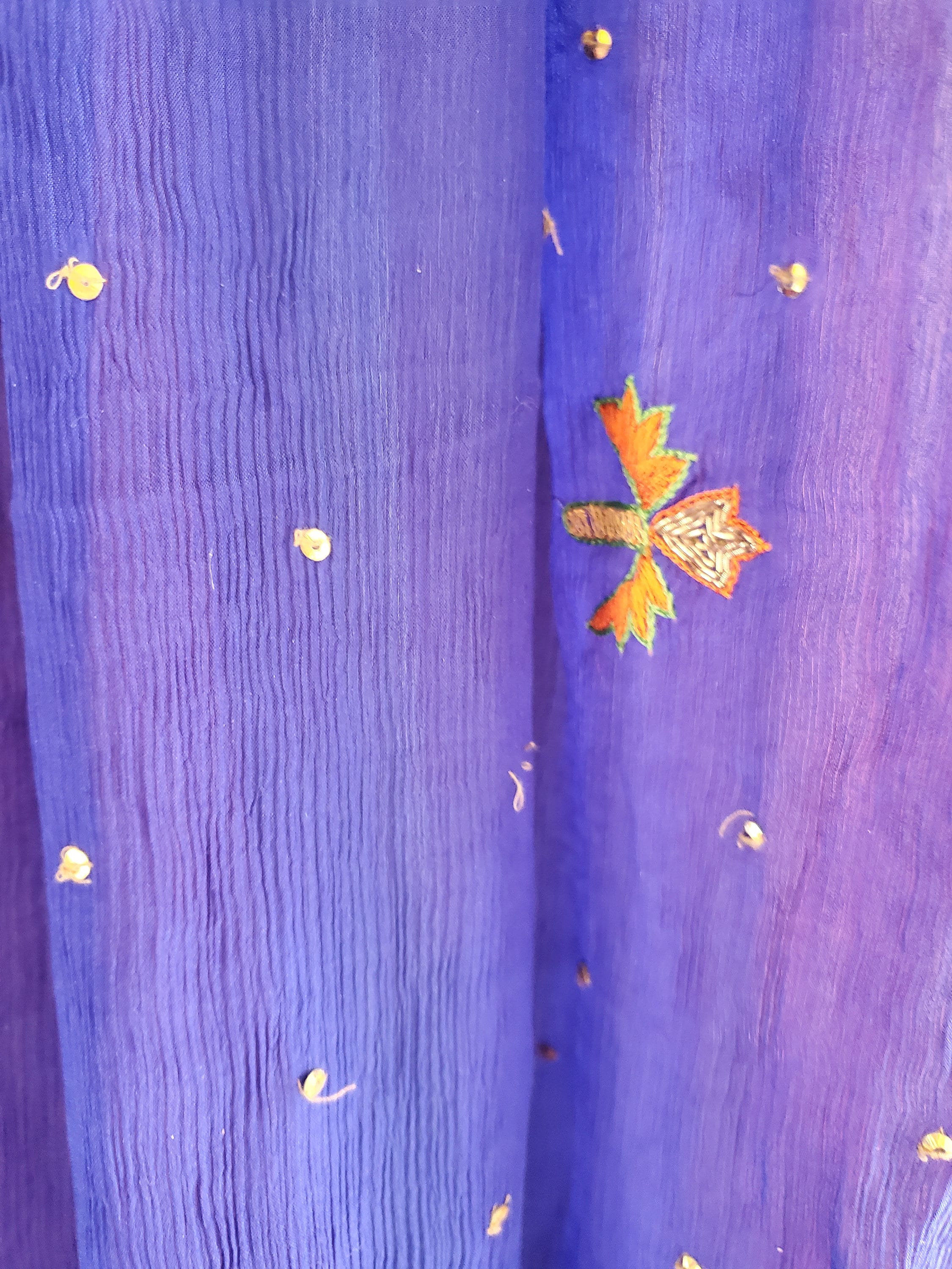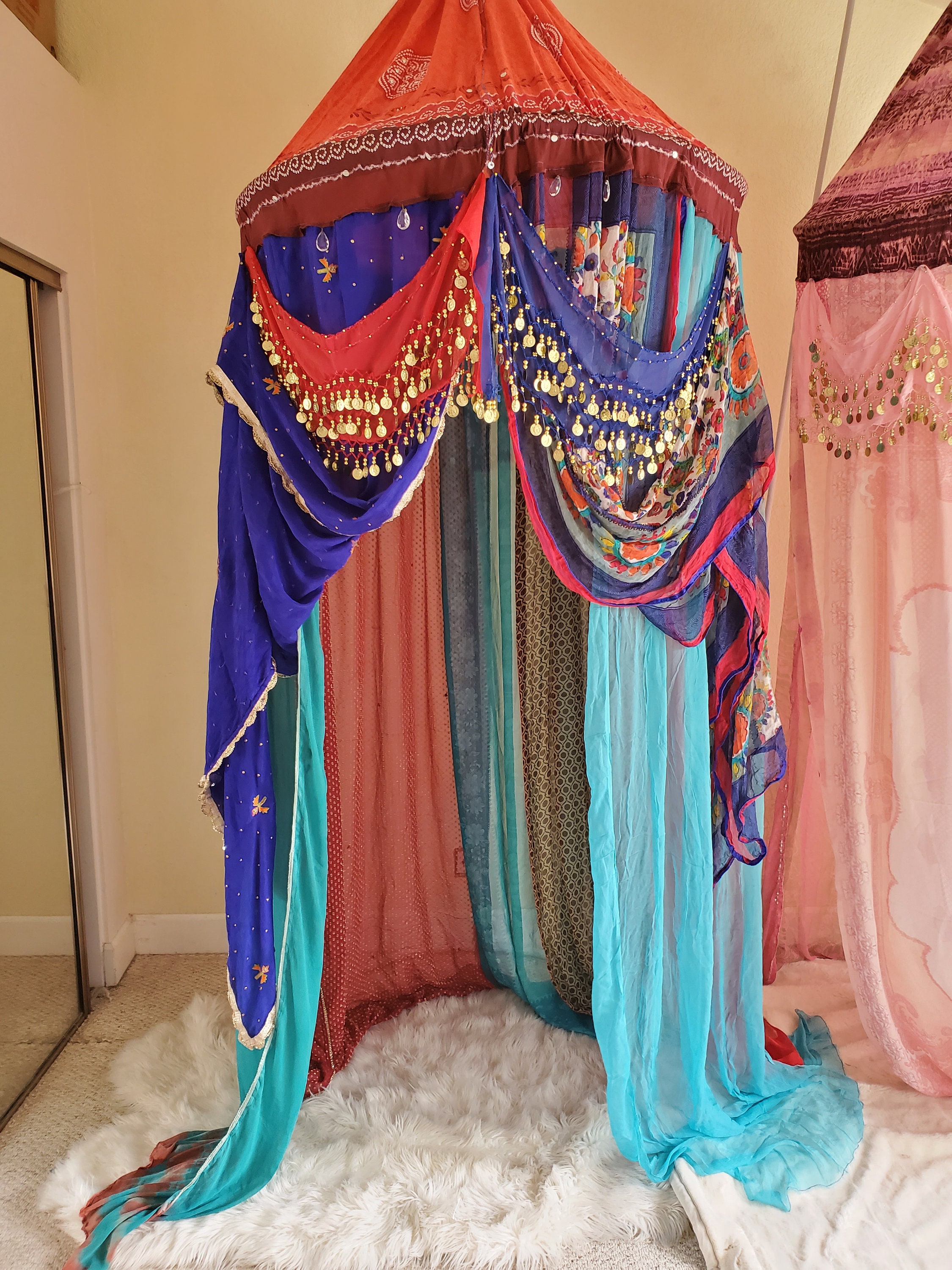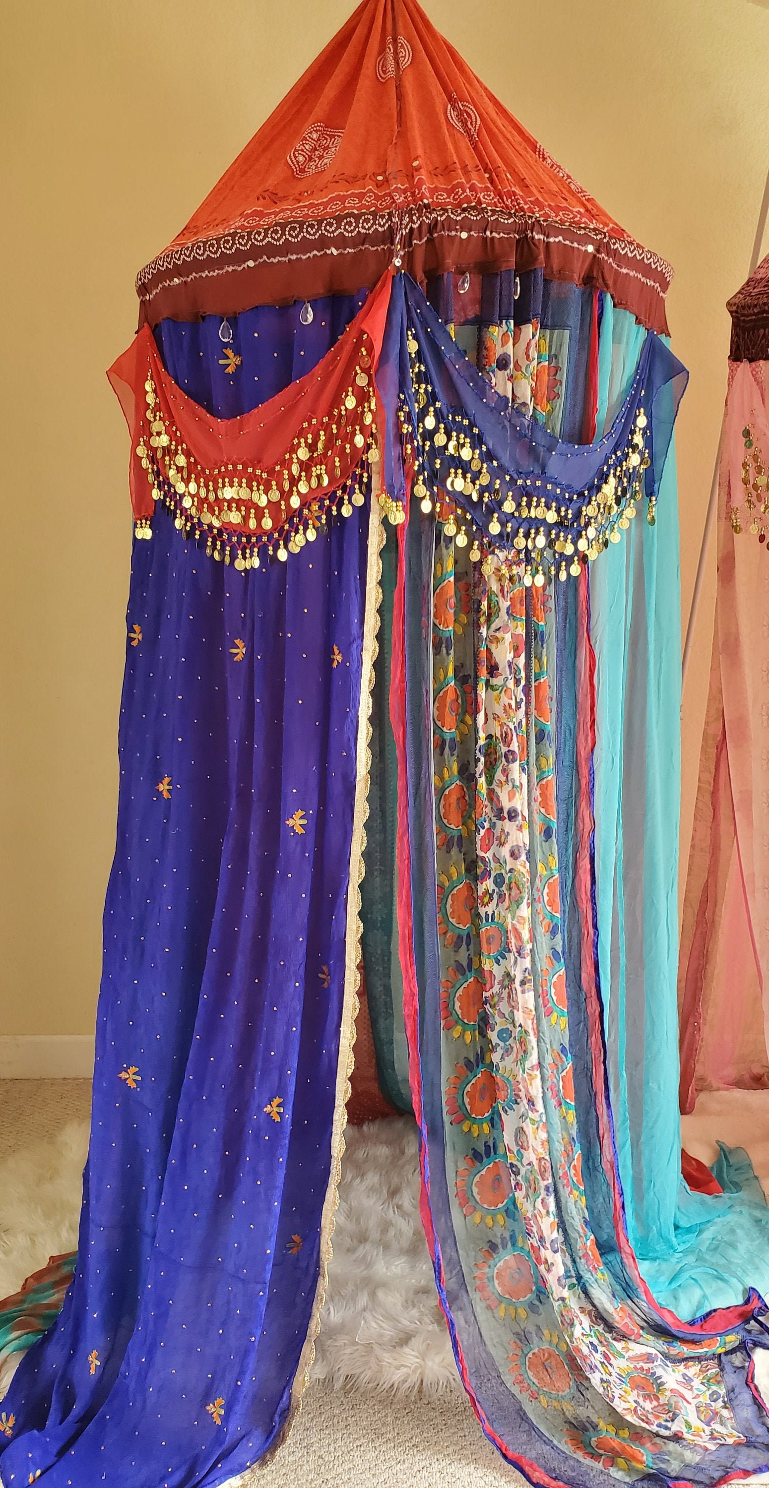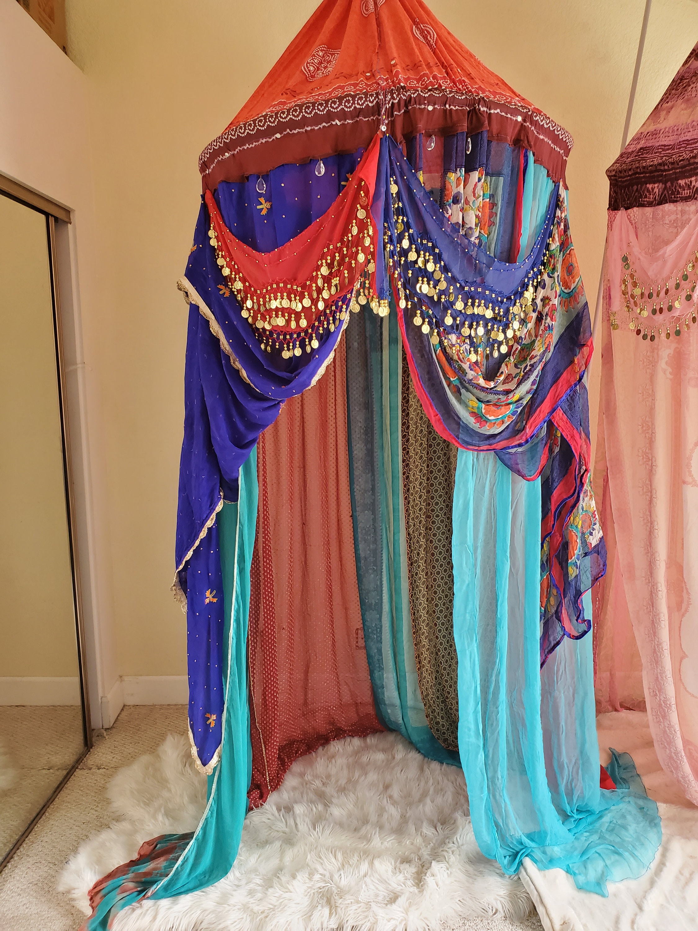 Made from upcycled Material, Cotton fabric, and hoop. 40 inches around and at least 12 - 15 feet in height. The sides can be spread out and pinned up for a larger area. Beautiful red and blue gypsy belts with coins was added to compliment the magical qualities of this canopy. Four crystals have been added to the front to represent Love, Health, Happiness and Prosperity.