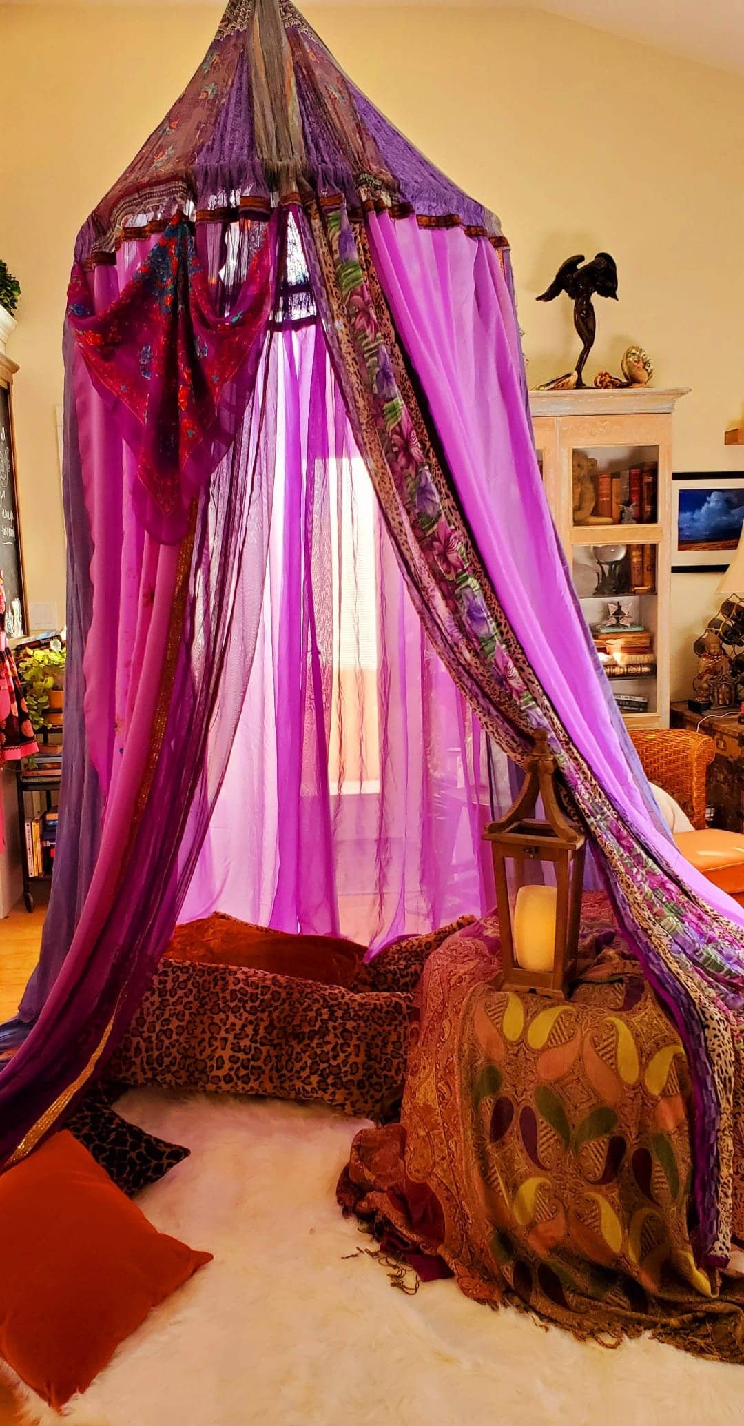 Great for hanging up over your bed or favorite reading chair. Can be used in the garden or as a meditation tent. Nice hideout for some quiet time. Very dreamy when sitting under it. You can let your imagination run wild or just give your mind a break.