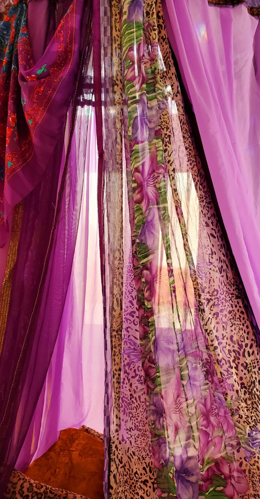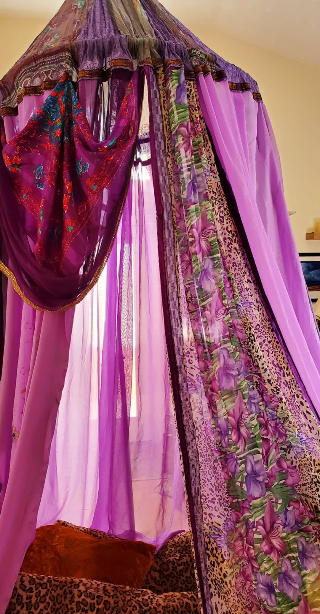This Bohemian Kaleidoscope canopy is called "Lavendar Dreams". Very lively and fun colors. Whimsical and airy.