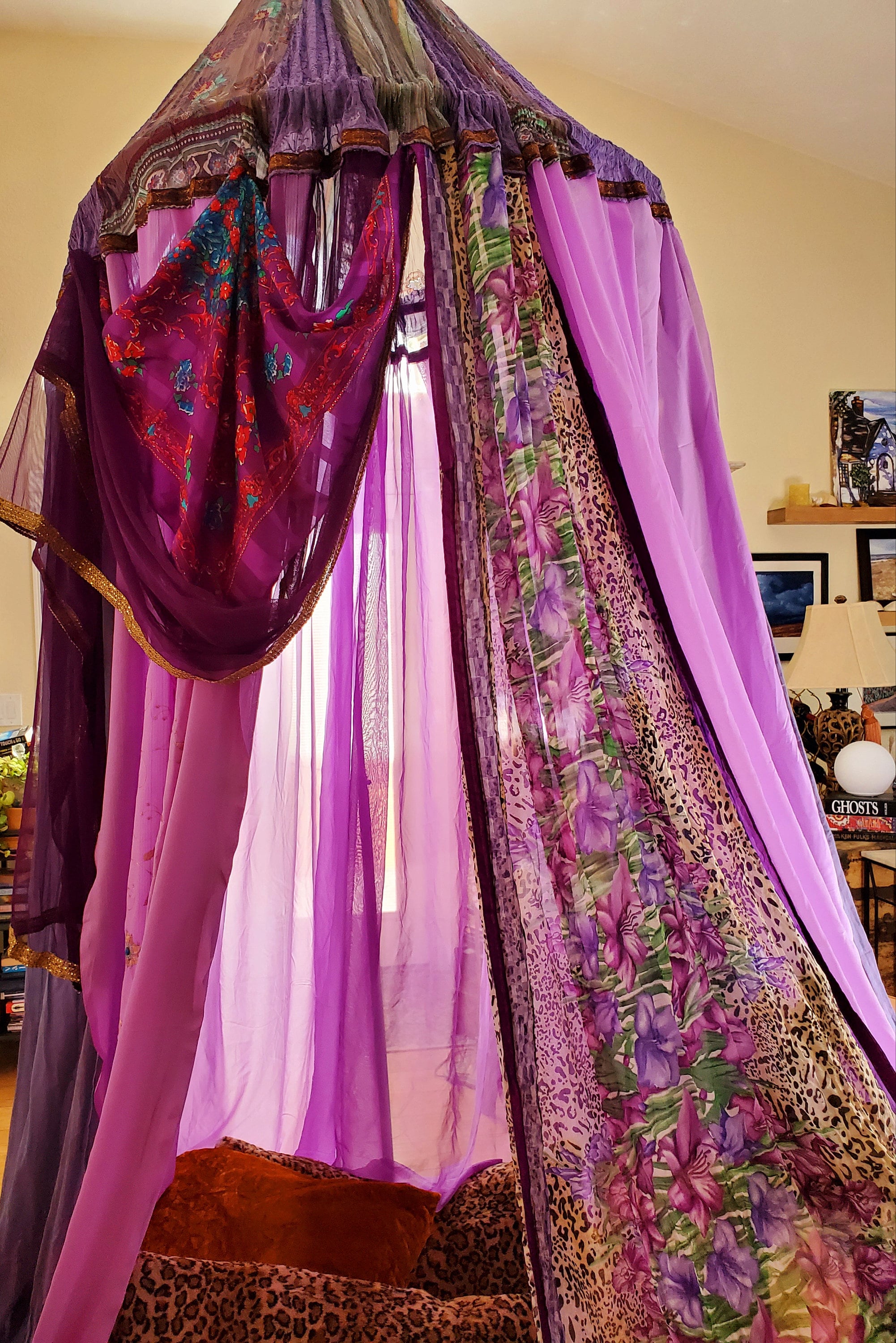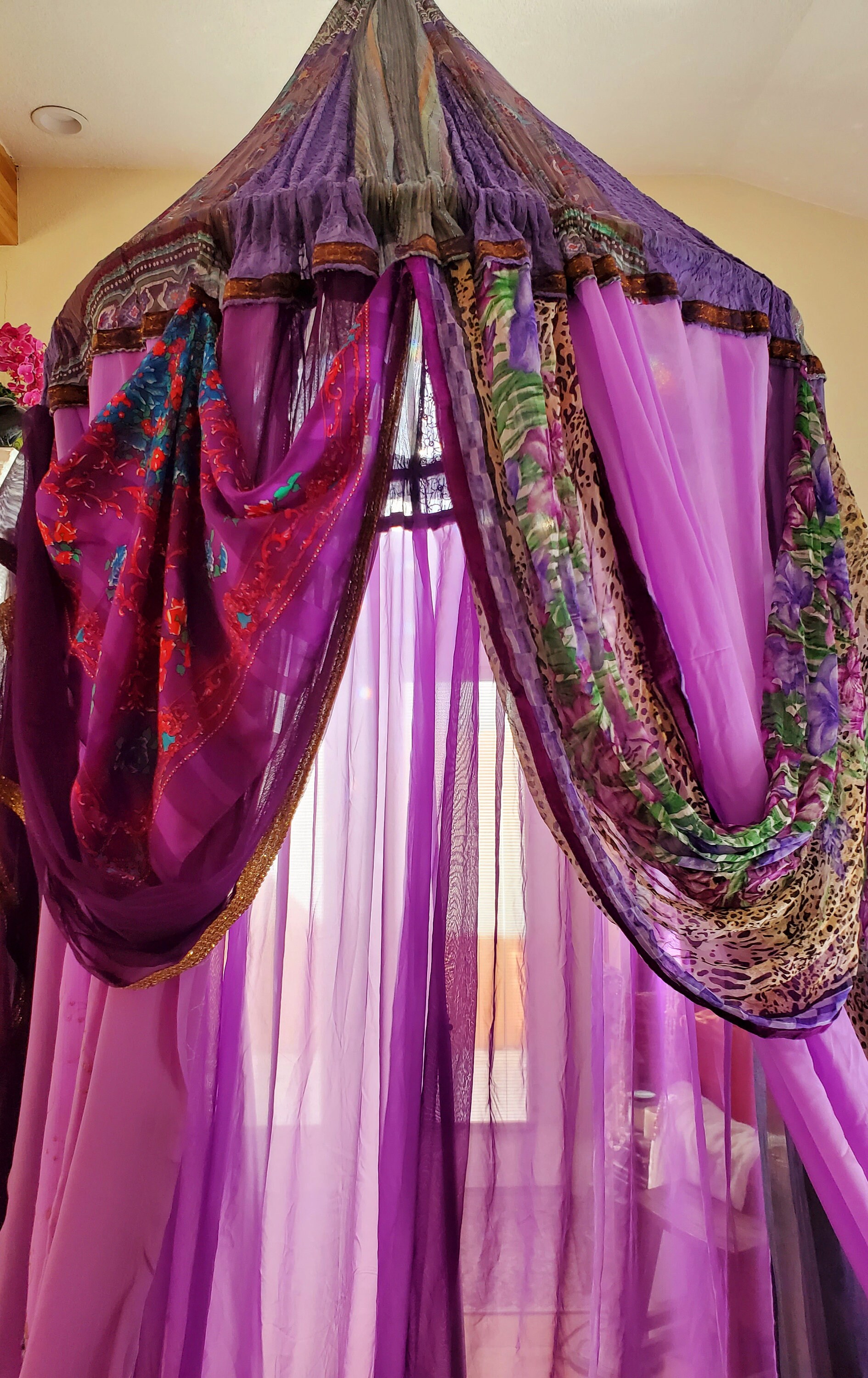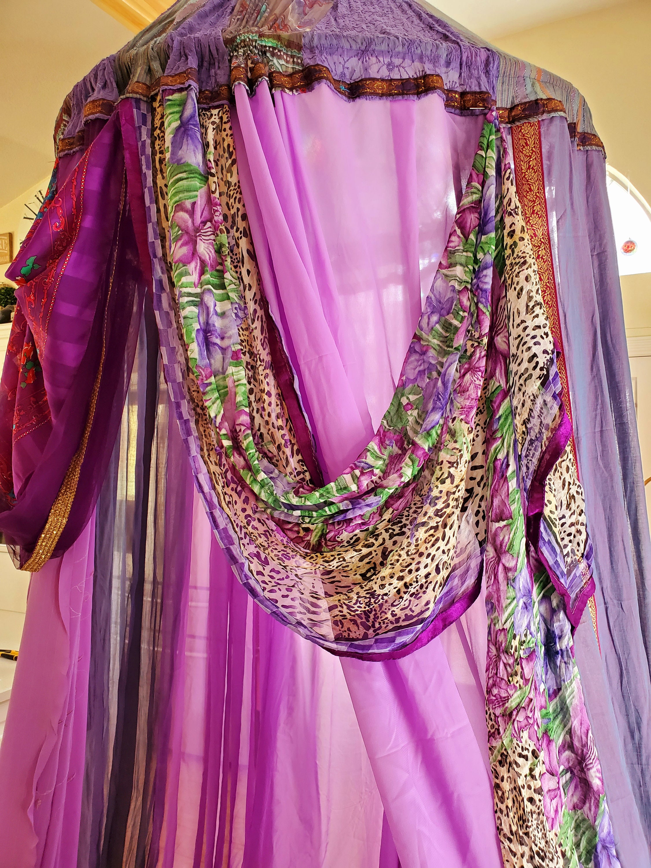 Made from upcycled and vintage materials, Indian Sari's and plastic hoop. The canopy is 40 INCHES AROUND AT THE TOP (hoop), 6 feet or more spreadable material at the base which makes it comfortable in size for 2 to more people to relax in comfort. The canopy stands from 12 - 15 feet in height. The height is adjustable depending on your needs - could be lowered as well. The sides can be spread out and pinned up for a larger area.