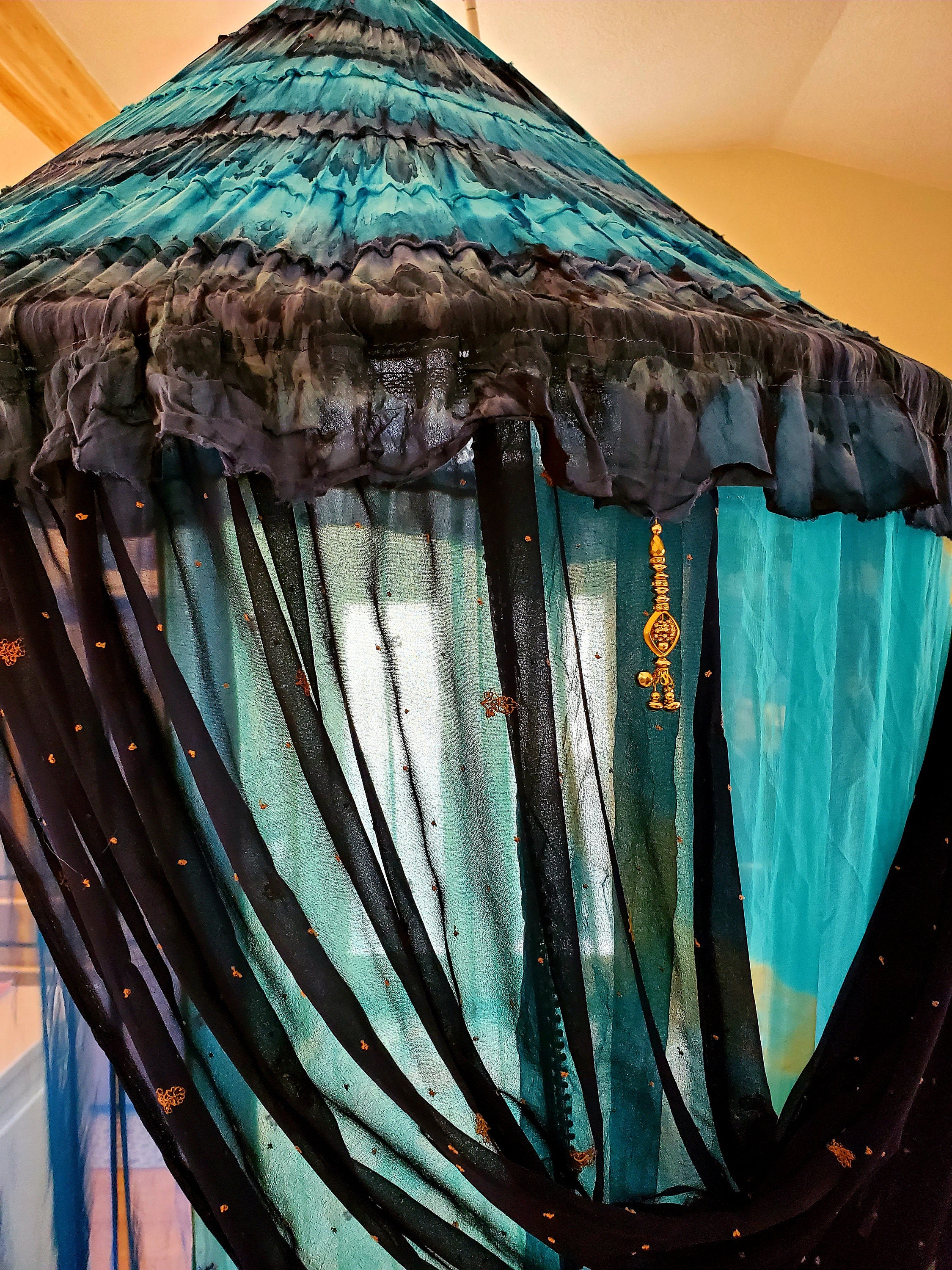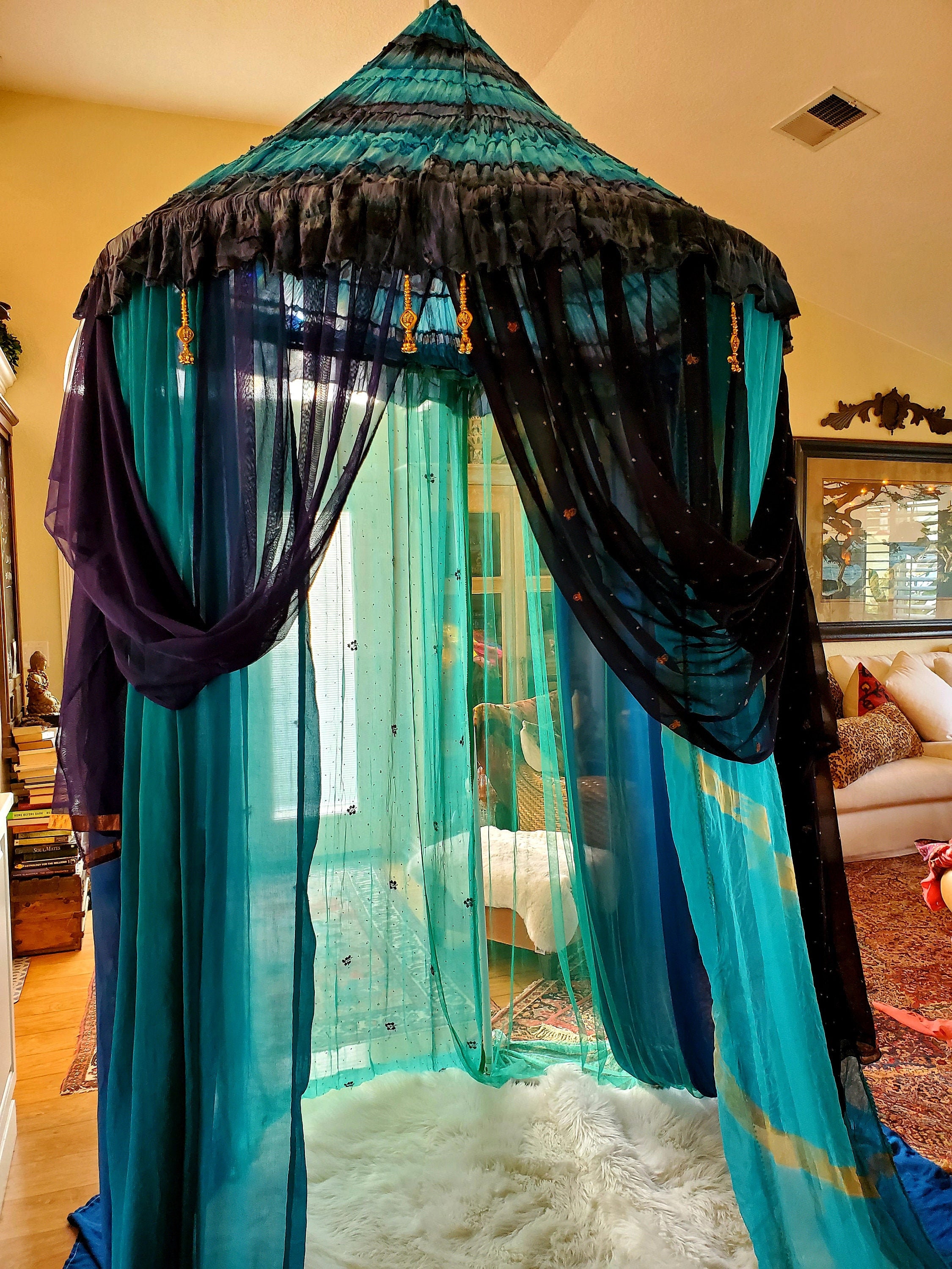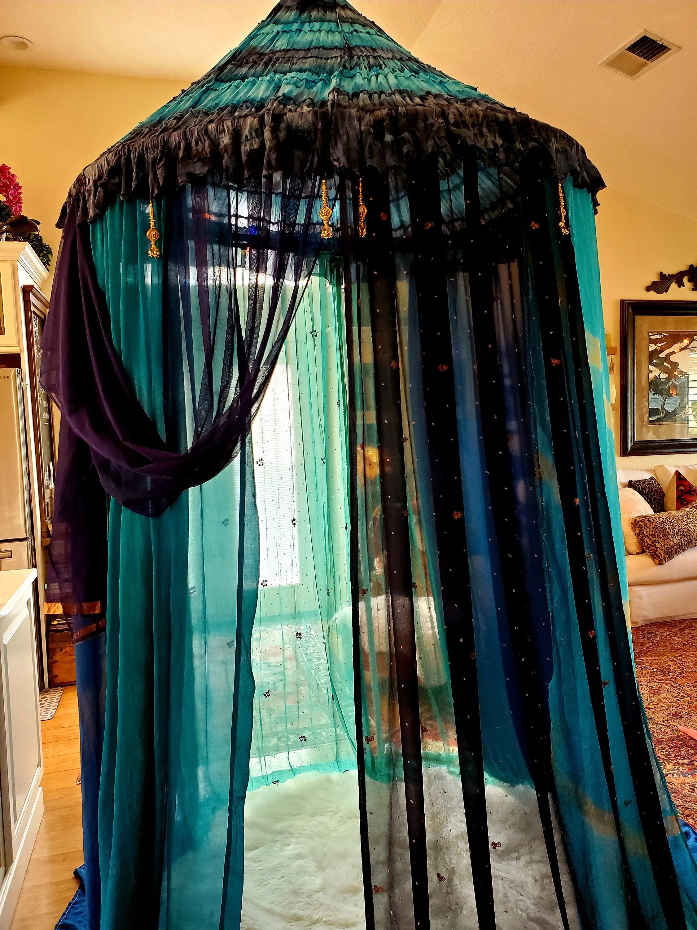 Made from upcycled and vintage materials, Indian Sari's and plastic hoop. The canopy is 48 INCHES AROUND AT THE TOP, 6 feet or more spreadable material at the base which makes it comfortable in size for 1- 2 to more people to relax in comfort. The canopy stands from 10 - 12 feet in height. I am 5’ 7” and can walk into the canopy without ducking my head. The height is adjustable depending on your needs - could be lowered as well. The sides can be spread out and pinned up for a larger area. This canopy is pure magic.