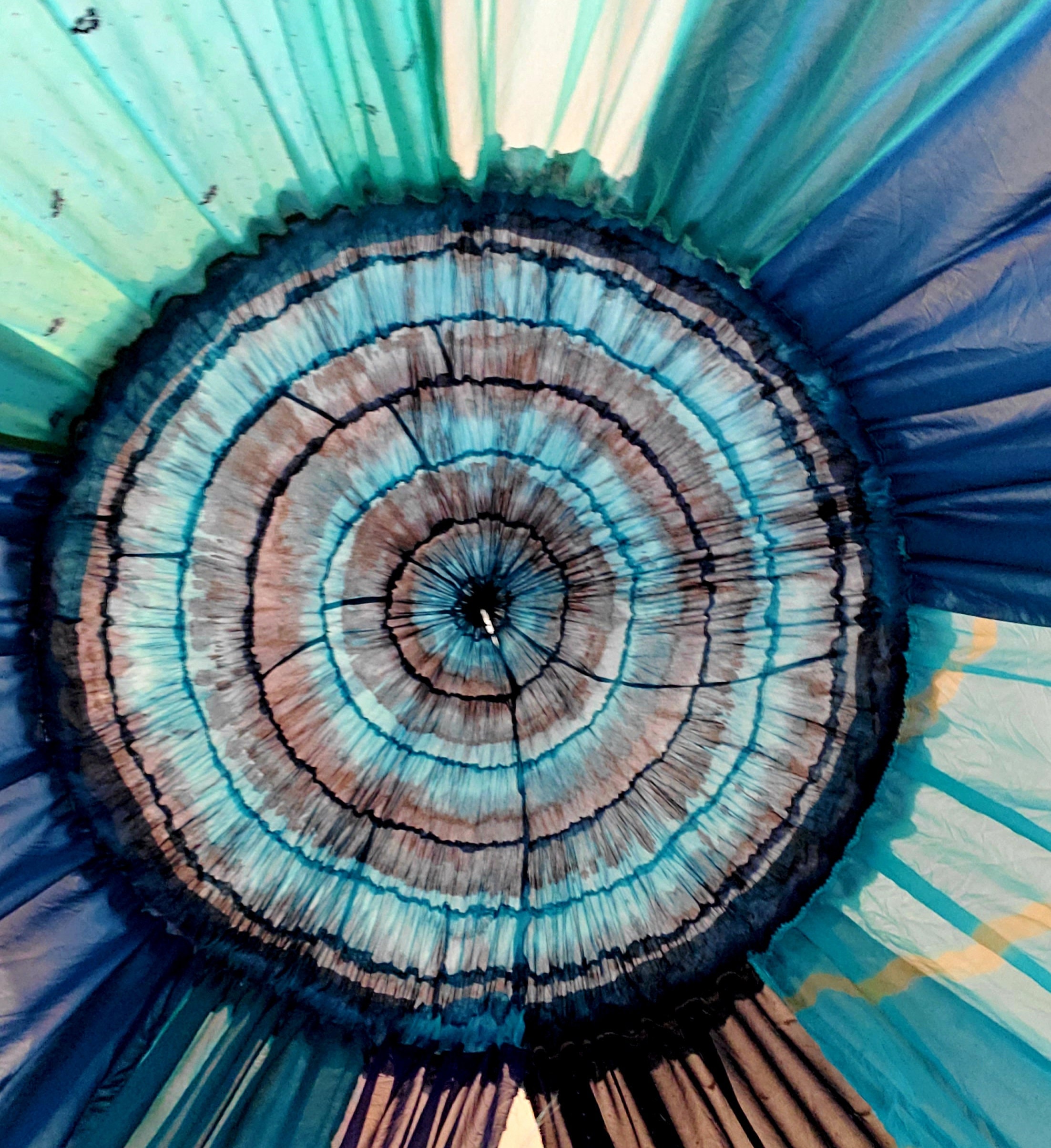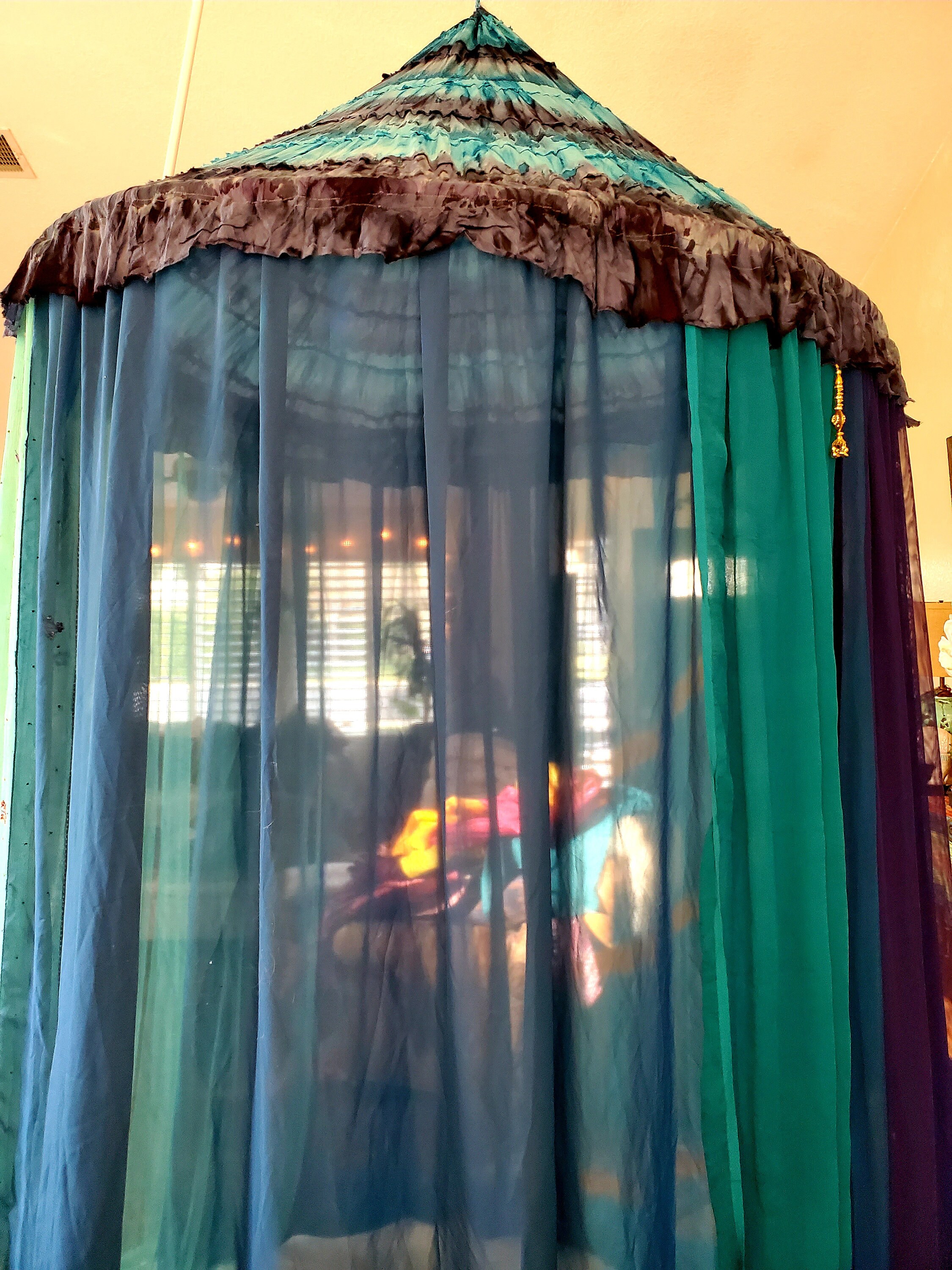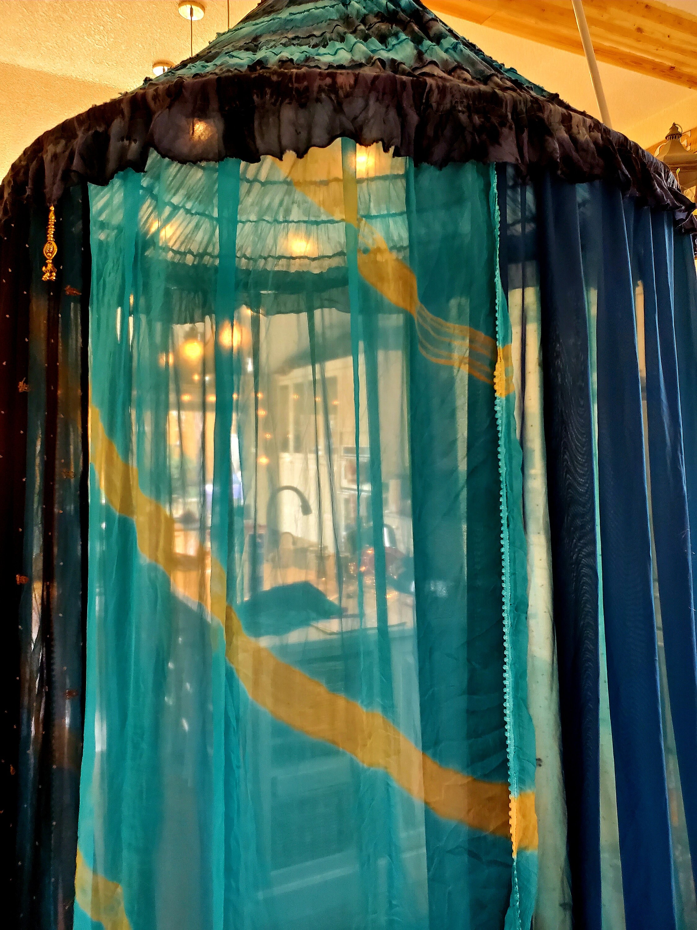 Made from upcycled and vintage materials, Indian Sari's and plastic hoop. The canopy is 48 INCHES AROUND AT THE TOP, 6 feet or more spreadable material at the base which makes it comfortable in size for 1- 2 to more people to relax in comfort. The canopy stands from 10 - 12 feet in height. I am 5’ 7” and can walk into the canopy without ducking my head. The height is adjustable depending on your needs - could be lowered as well. The sides can be spread out and pinned up for a larger area. This canopy is pure magic.